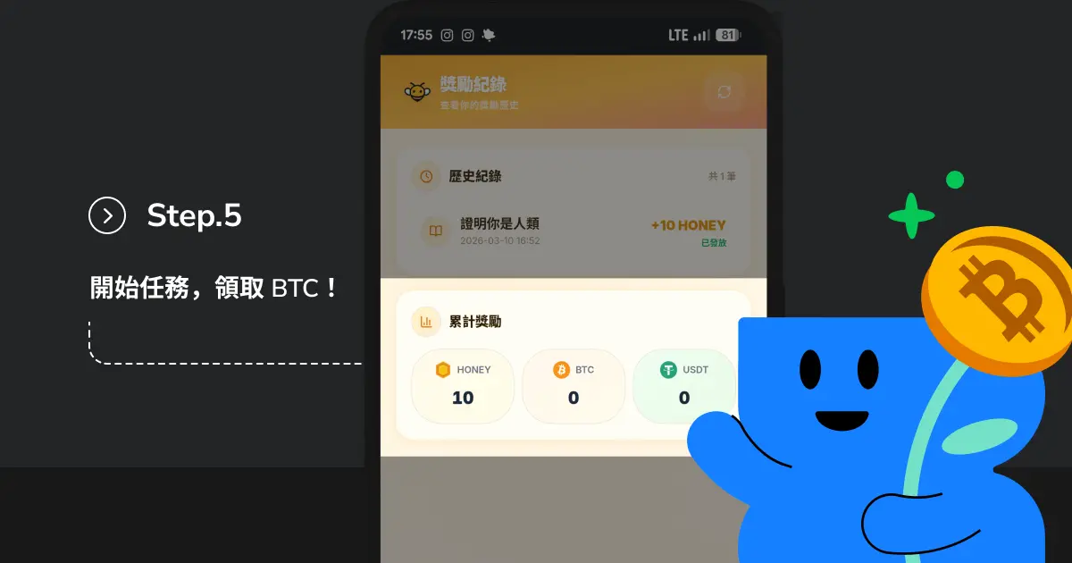 - 開始進行任務,領取 BTC 獎勵