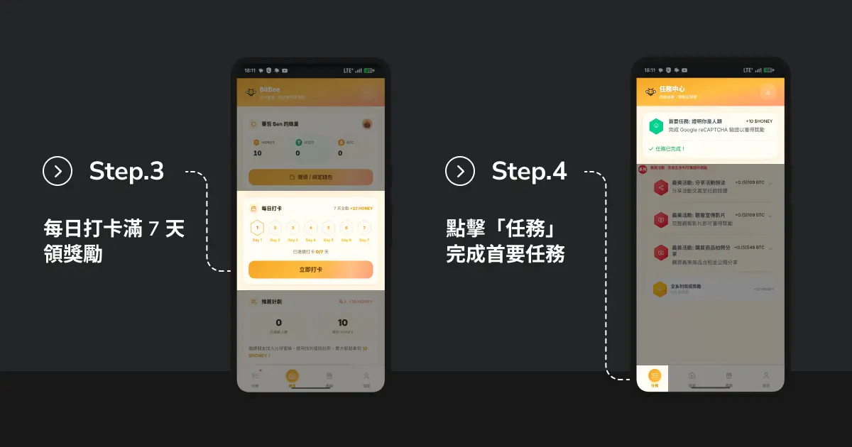 在 BitBee 中,你可以透過每日簽到以及完成各式任務,獲得 HONEY、USDT、BTC 等獎勵