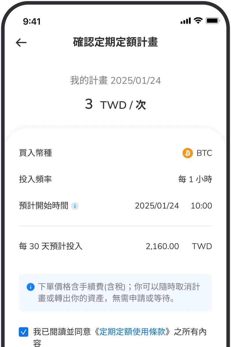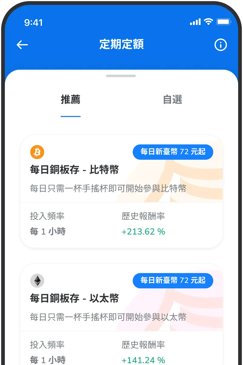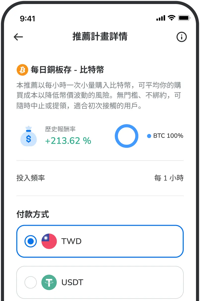 由我們精心挑選加密幣種與投資頻率,只需選擇金額並一鍵下單,讓你無需擔心細節,輕鬆開始